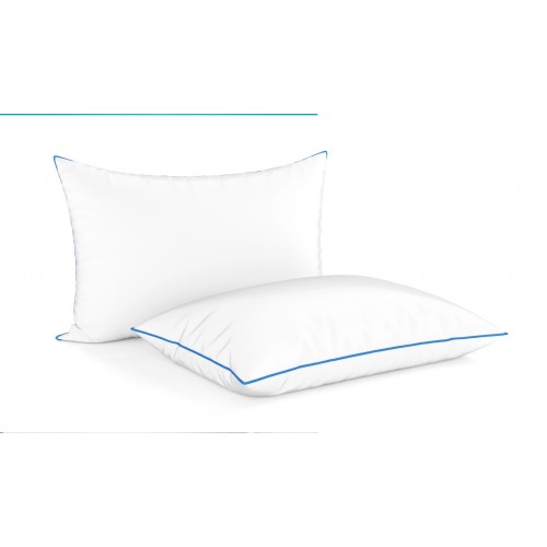 Наполнитель равномерно распределен внутри и придает подушке приятную упругость. Чехол из микрофибры обладает впитывающей способностью, долговечностью и гипоаллергенностью, а декоративный синий кант по периметру добавляет изящности.