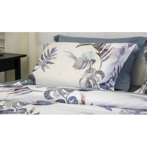 Комплект постельного белья Tropics (Трописк) новой коллекции Askona Trend наполнит вашу спальню неповторимой атмосферой путешествий – с нотками экзотики и приключений. Ярко-белая ткань насыщена крупными листьями необычных форм. Холодные пастельные цвета растительного принта оригинально «подсвечены» теплыми оттенками, что создает впечатление «игры» красок и линий.